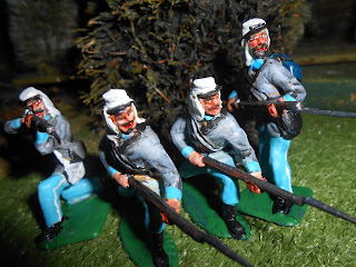 When I was in Melbourne recently I acquired a handful of plastic ACW figures and as I had some putty I made some minor changes. The figures in havelocks depict Argentinian National Guard who wore uniforms almost identical to ACW Confederate ones from the early war years. The material was actually bought from the USA so I don't know if they were captured CSA stocks or from cloth for the early grey militia and volunteer uniforms of the North. They had white trouser stripes.