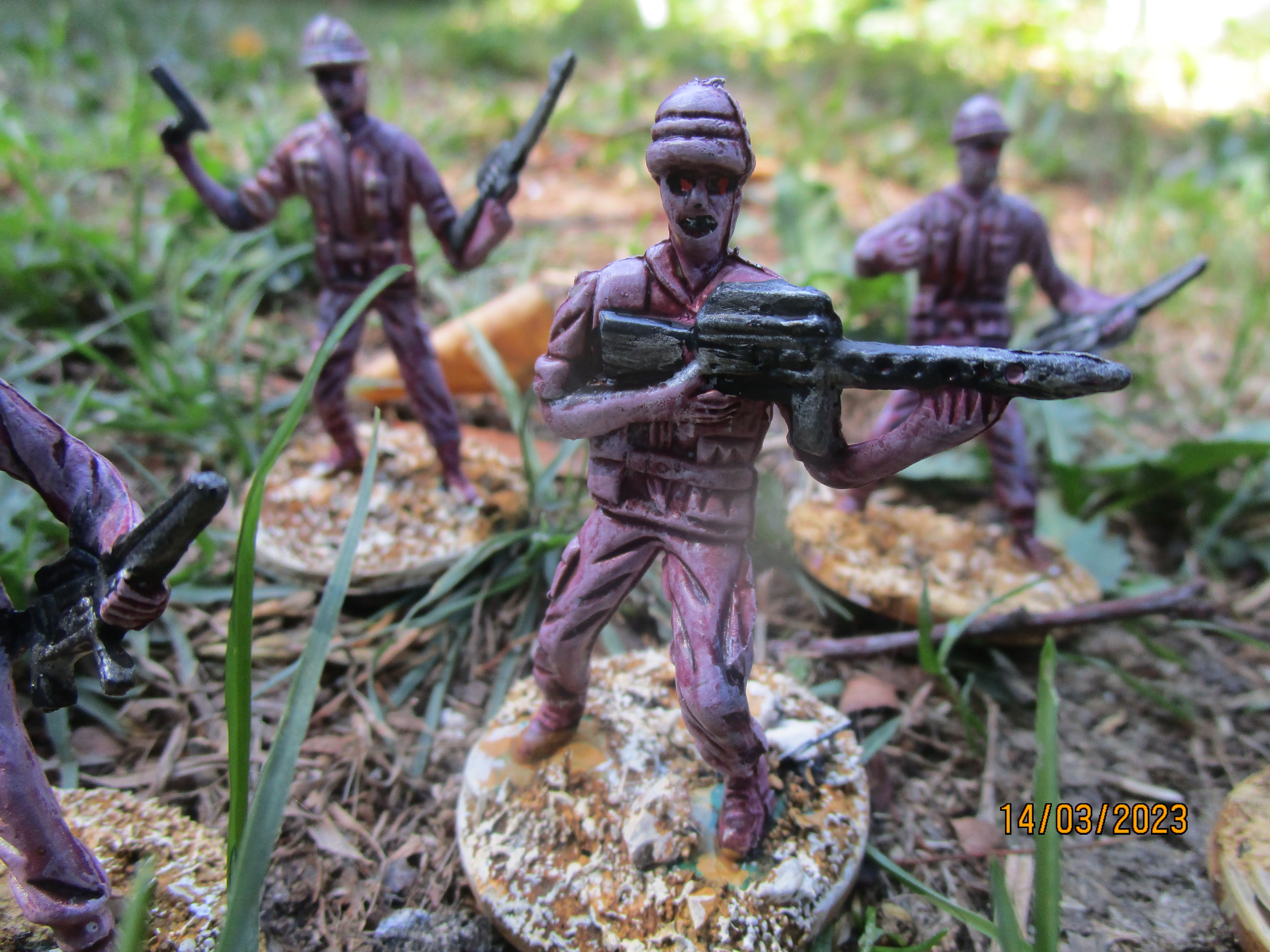 The unit now has ten figures. I trimmed off pistols on some figures and used boiling and cold water to bend some arms. When I tried it on legs and waist and I broke them on one figure so I melted the legs back with a candle. I decided he was a wounded figure. There were still gaps so I painted blood red there to show where he/it had been shot.